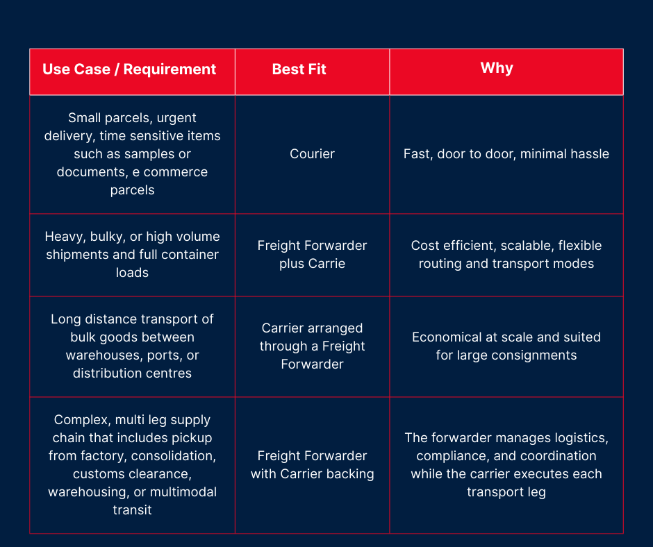 Making the right choice between a courier, a freight forwarder, or a carrier, or combining them, depends on your shipment’s specific requirements. Here is when each makes sense: